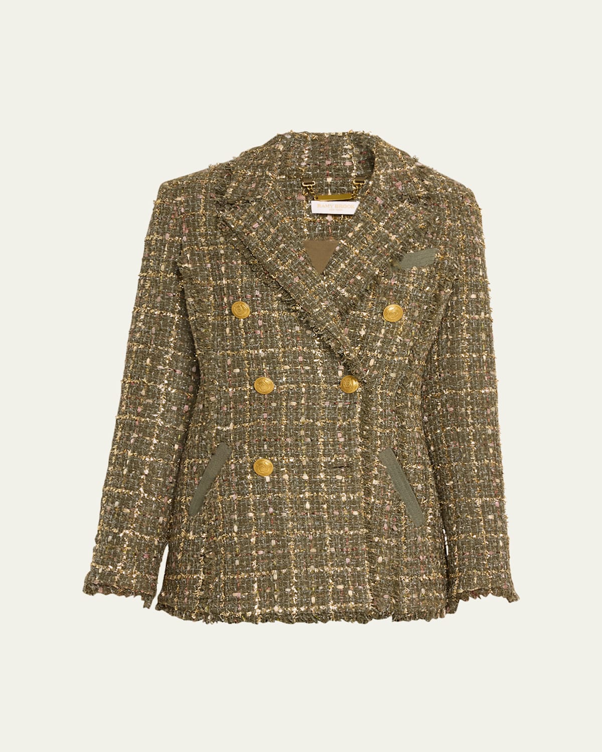 Ramy Brook "Marsha" tweed blazer accented with embosseddome buttons and fringe trim Approx. 26"L from shoulder to hem Notched lapels; doublebreasted front Chest welt pocket Long sleeves; button cuffs Sideentry pockets Vented back Midlength Cotton/acrylic/polyester Dry clean Imported