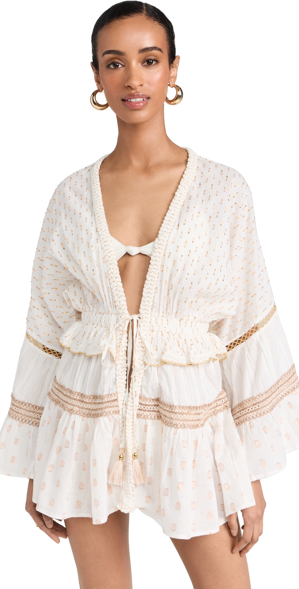 Fabric: Lightweight, non-stretch voile. Braided placket with tassel tie closure. Tiered silhouette and ruffle skirt. Crochet trim. Flocked metallic threading. Long bell sleeves. Covered elastic waistband. Shell: 80% cotton/20% metallic. Wash cold. Imported, India. Measurements: Measurements from size XS Length: 28.25in / 72.0cm, from shoulder
