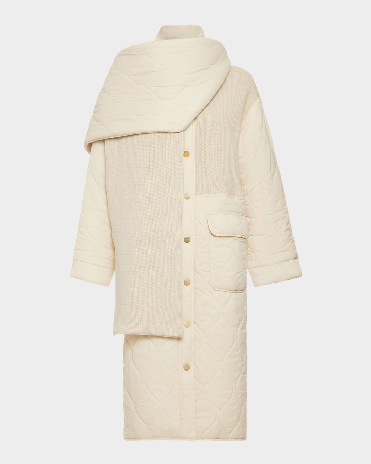 The Melanie onionquilted coat by Ramy Brook features a ribbed bodice Approx. 42"L from shoulder to hem Baseball collar; snap front Long sleeves Front flap pockets Hem falls below the knee Relaxed fit Nylon/polyamide Lining: Polyester Dry clean Imported
