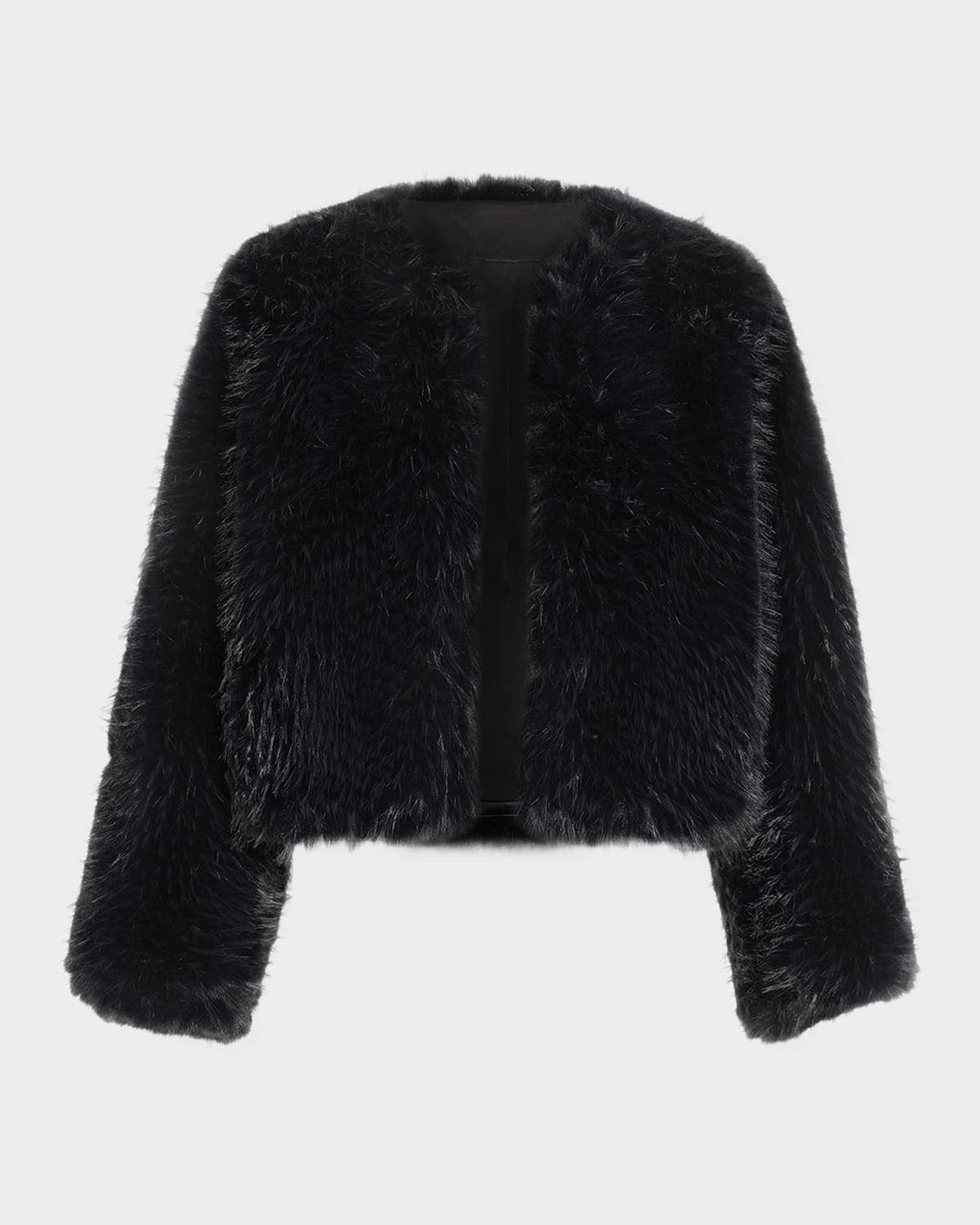The Nikkia jacket by Ramy Brook is crafted from cozy faux fur (polyester) Approx. 25"L from shoulder to hem Collarless neckline Long sleeves Relaxed fit Hip length Front hook closure Polyester Lining: Polyester Dry clean Imported