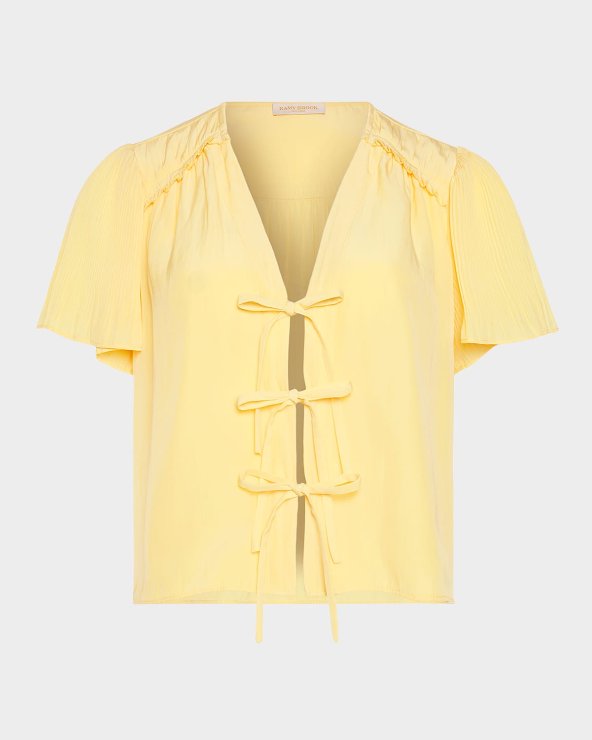 Ramy Brook "Selene" blouse framed with pleated sleeves and feminine ruffling Approx. 23"L from shoulder to hem V neckline Short sleeves Relaxed fit Hip length Front selftie closures Polyester Dry clean Imported