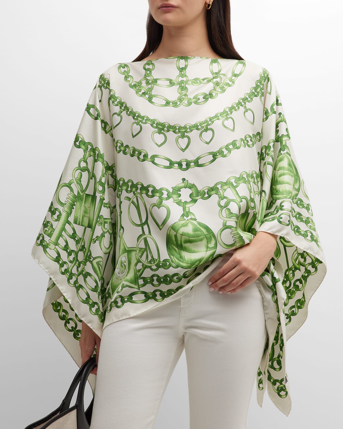 Rani Arabella "Bracelet" poncho in silk Limited edition Approx. 52"L Side vents Handrolled trim Assymetric hem Dry clean Made in Italy