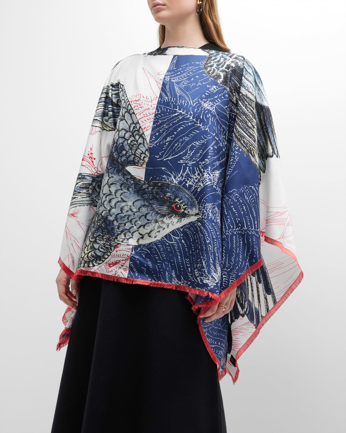 Rani Arabella poncho in silk featuring a sparrow motif Approx. 52"L Can work for all occasions. Limited edition, handmade from Rani Arabella scarves. Handrolled trim Dry clean Made in Italy