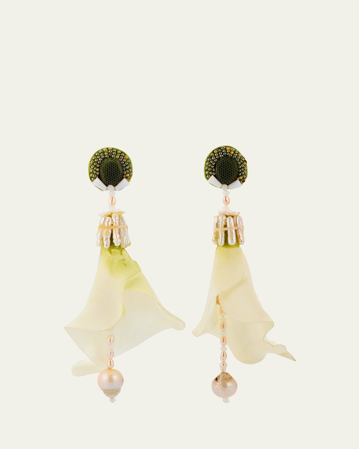 Crafted to resemble calla lilies, these oversized Ranjana Khan earrings are designed with soft silk and genuine pearls. Approx. 3.5" length Silvertone hardware Naturally hued freshwater cultured pearls Silk petals and glass beads Clipon backs Imported