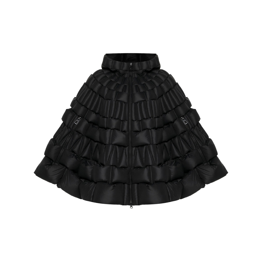black goose down padded design 3D basket weave front two-way zip fastening classic hood cape design two side zip-fastening pockets full lining curved hem