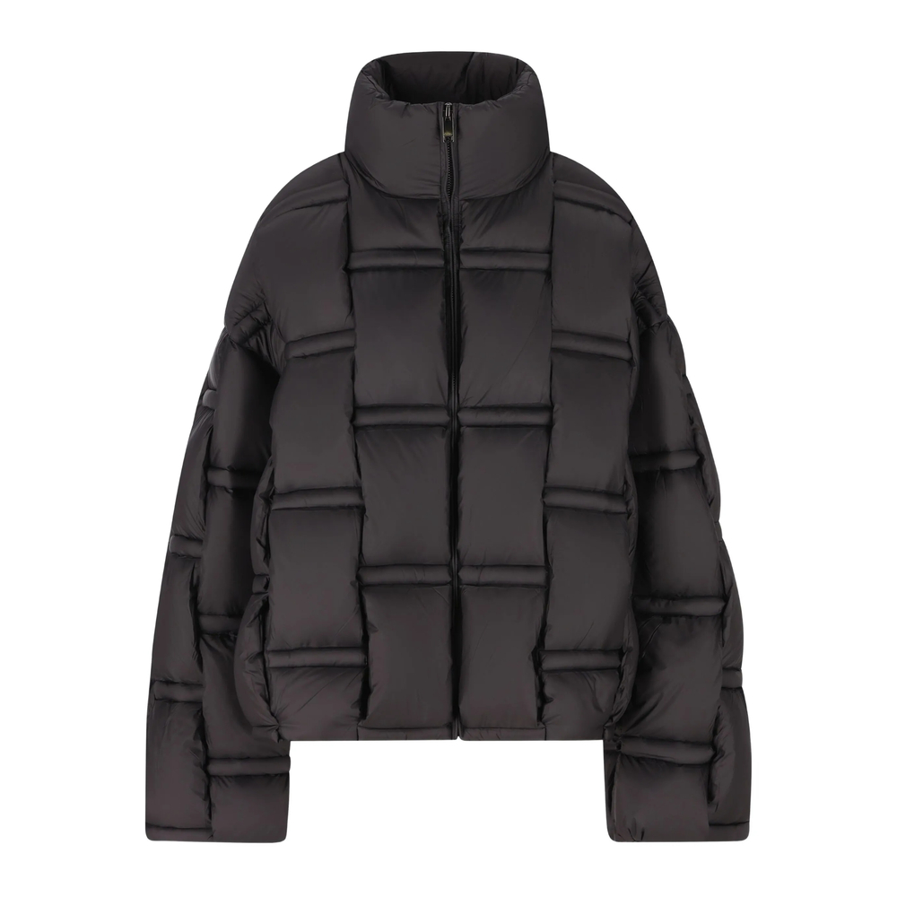 black geometric quilting high collar front zip closure long sleeves side zip-fastening pockets