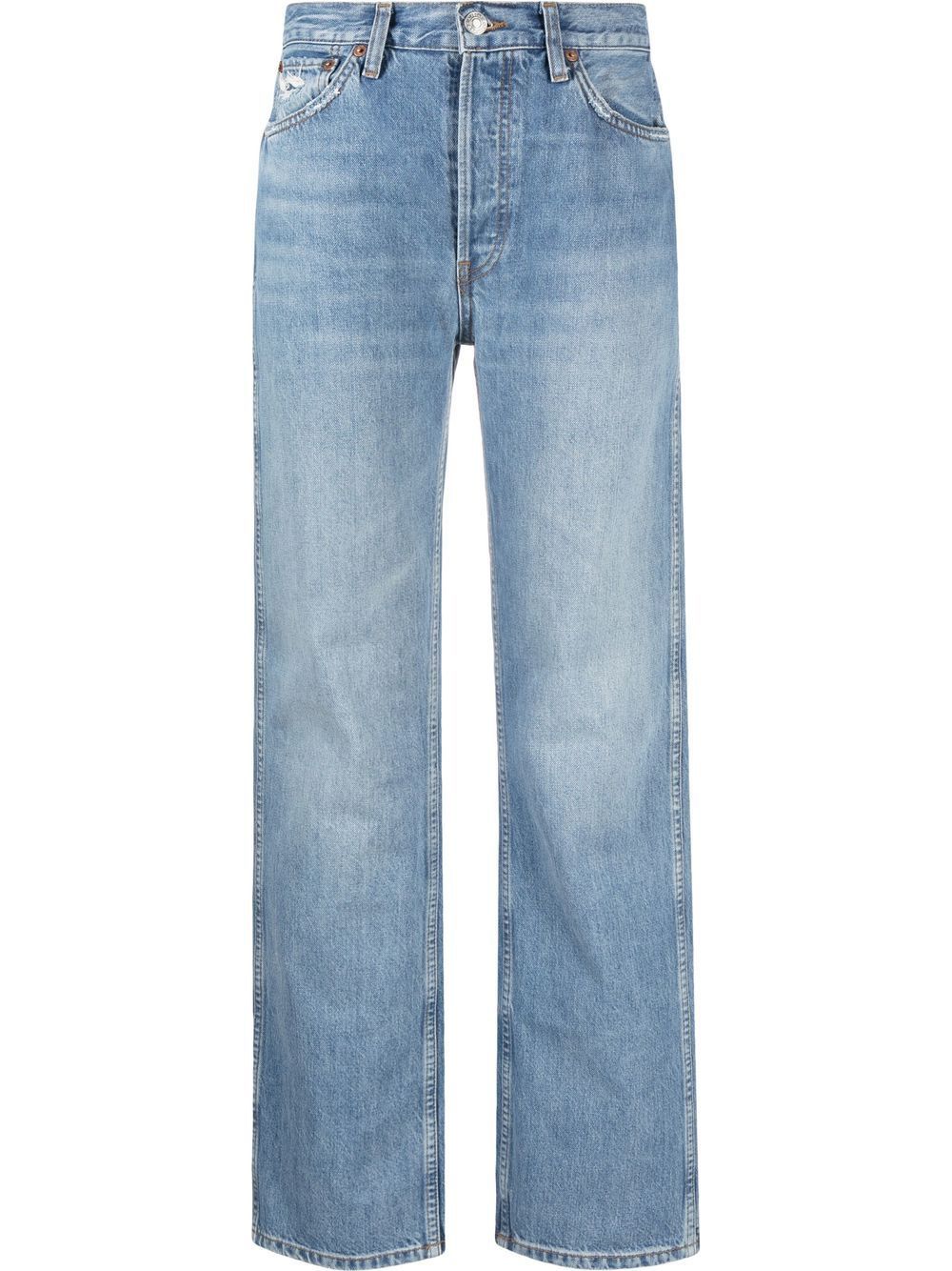 worn blue cotton straight leg high waist logo patch to the rear belt loops concealed fly and button fastening classic five pockets POSITIVELY CONSCIOUS: All RE/DONE denim products are made of repurposed vintage Levi's jeans that are turned into modern, designer-style products. You can be confident that your choice is positive for the Planet.