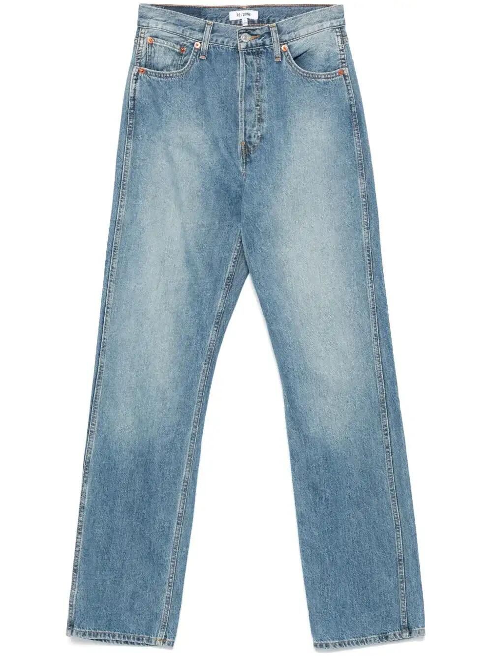 indigo blue concealed fly and button fastening classic five pockets belt loops logo patch to the rear