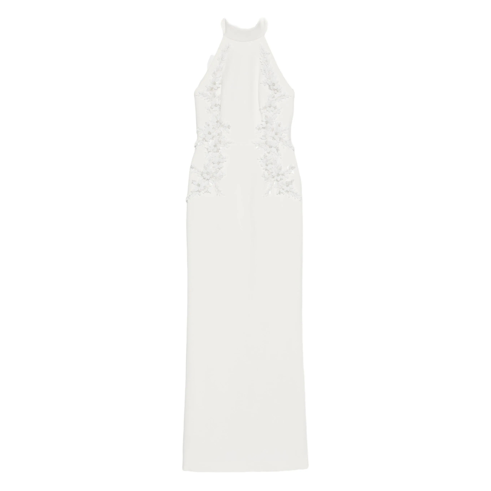ivory concealed rear zip fastening rear slit mock neck open back flower embellishments