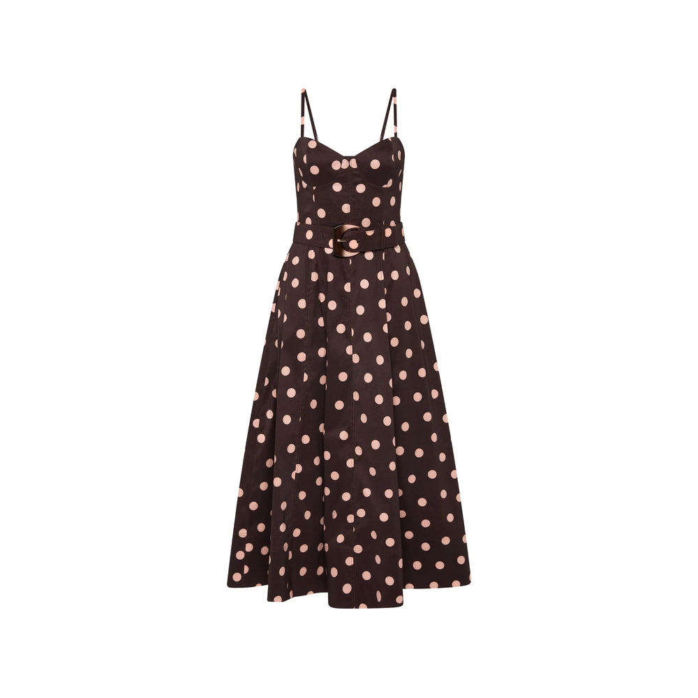 brown polka dot strap belt buckle fastening A-line side pockets