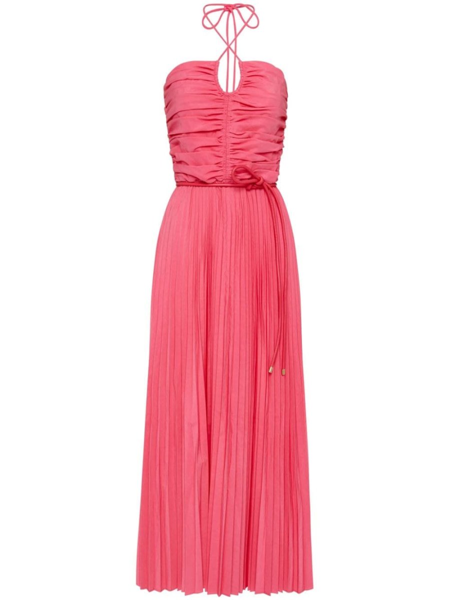 rose pink ruched bodice pleated skirt halterneck tie fastening sleeveless detachable belt