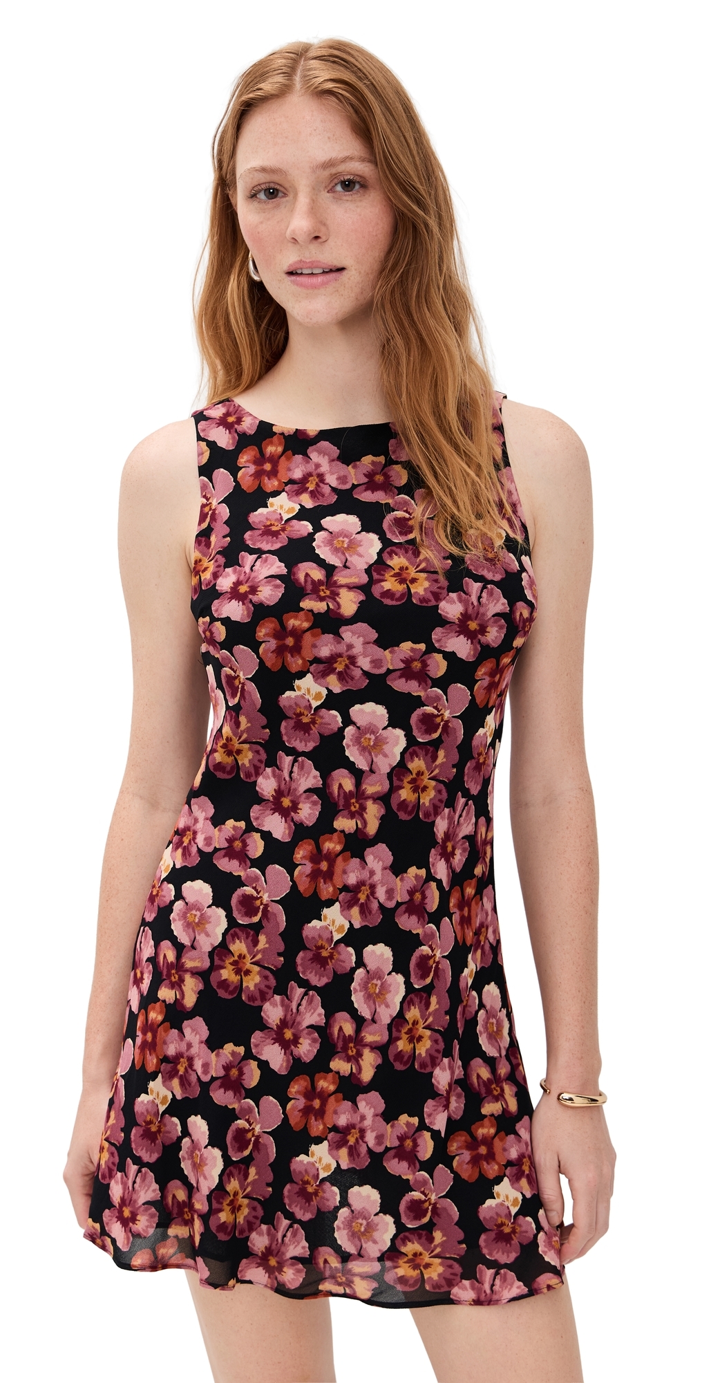 Fabric: Lightweight, low-stretch georgette. Reformation is part of The Climate Pledge, a commitment to reaching net-zero carbon emissions by 2040. Floral print. Bias cut. Mini length. Boat neck. Sleeveless. Pullover design, no closure. Shell: 100% viscose. Lined. Dry clean. Imported, Vietnam. Measurements: Measurements from size S Length: 32in / 81.0cm, from shoulder to front hem