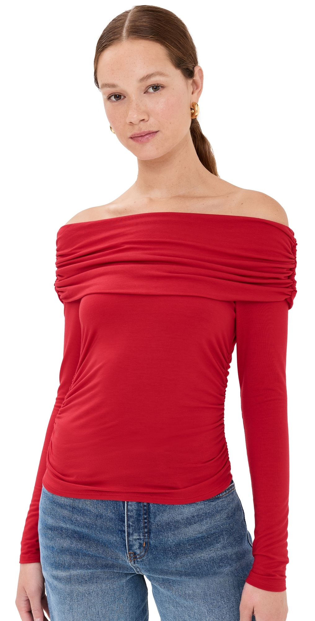 Fabric: Mid-weight soft jersey. Reformation is part of The Climate Pledge, a commitment to reaching net-zero carbon emissions by 2040. Produced via carbon-neutral manufacturing. Ruching details. Off-shoulder neckline. Shell: 88% lyocell/12% spandex. Wash cold. Made in the USA. Long sleeves. Measurements: Measurements from size S Length: 17.25in / 44.0cm, from shoulder