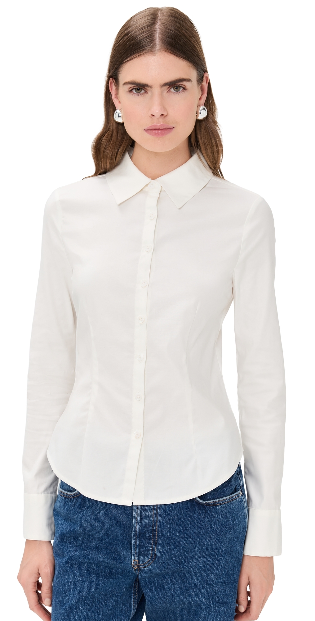 Fabric: Lightweight stretch shirting. Reformation is part of The Climate Pledge, a commitment to reaching net-zero carbon emissions by 2040. Collared neck. Long sleeves with button cuffs. Button placket. Shell: 98% cotton/2% spandex. Wash cold. Imported, Vietnam. Measurements: Measurements from size 0 Length: 22.75in / 58.0cm, from shoulder