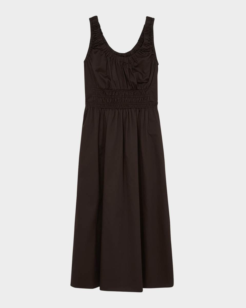 Reiss "Anouk" ruched midi dress crafted in lightweight and breathable cotton Features contrast embroidery on the sides Scoop neckline Sleeveless Front and back smocking Onseam pockets Double side slit hem Hem falls below the knee Aline silhouette Slipover style Cotton Machine wash Imported