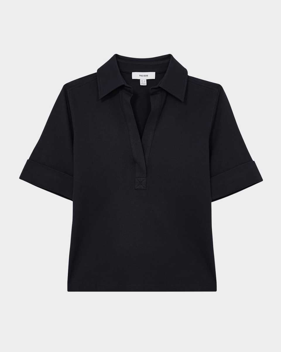 Reiss "Astrid" polo shirt in mediumweight fabric V neckline with spread collar Short sleeves Rolled cuffs Relaxed fit Pullover style Viscose/polyester/elastane Imported