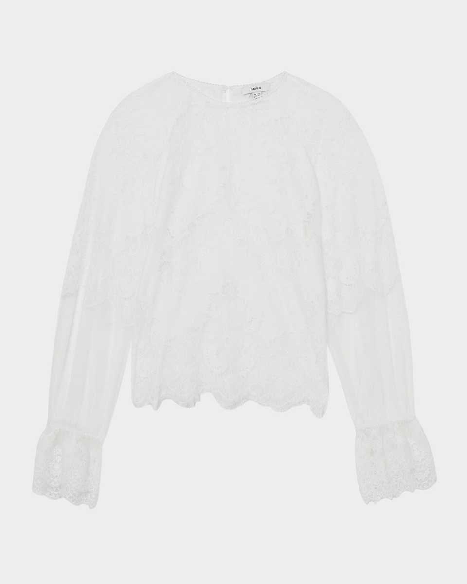Reiss "Emilia" blouse crafted in floral lace and mesh Scalloped edges and eyelash fringe hem Crew neckline Long raglan blouson sleeves Elasticized ruffle cuffs Relaxed fit Keyhole button back Pullover style Nylon/polyamide/cotton Imported