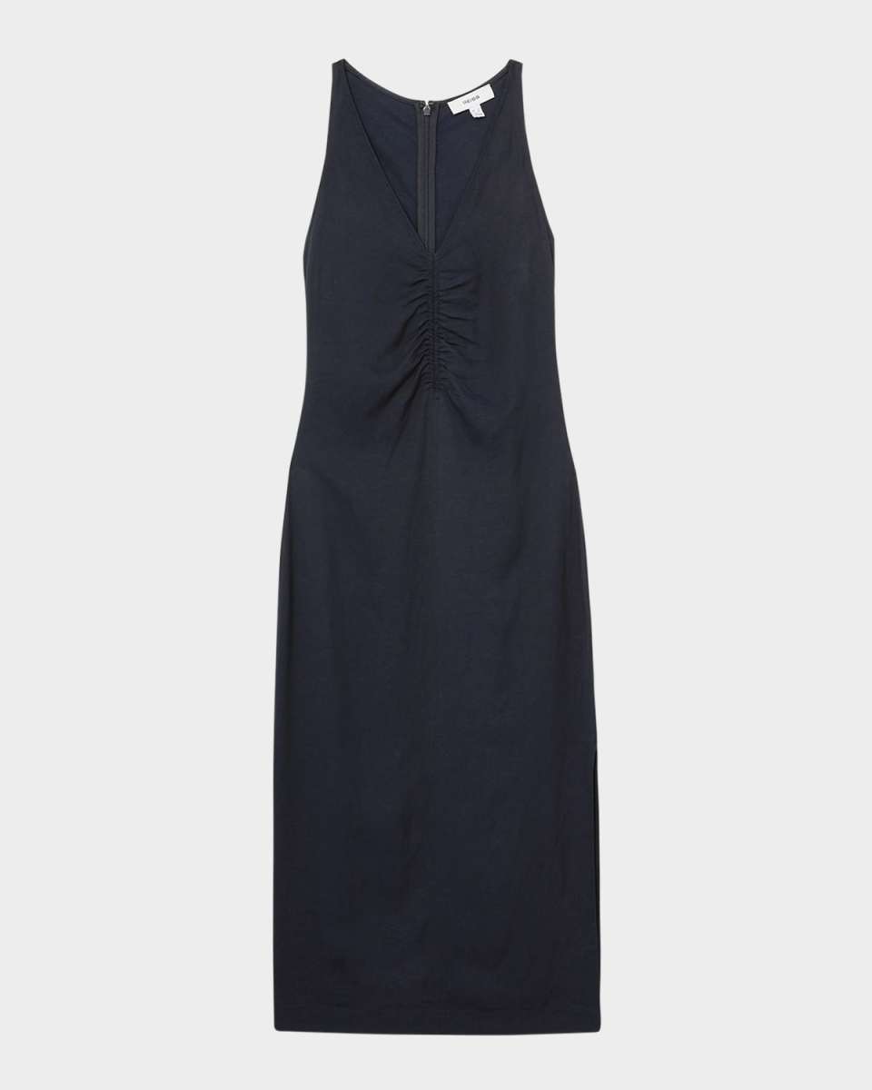 Reiss "Pari" lightweight midi dress detailed with front and back ruching V neckline Sleeveless Hem falls below the knee Aline silhouette Back zipper Viscose/linen Machine wash Imported