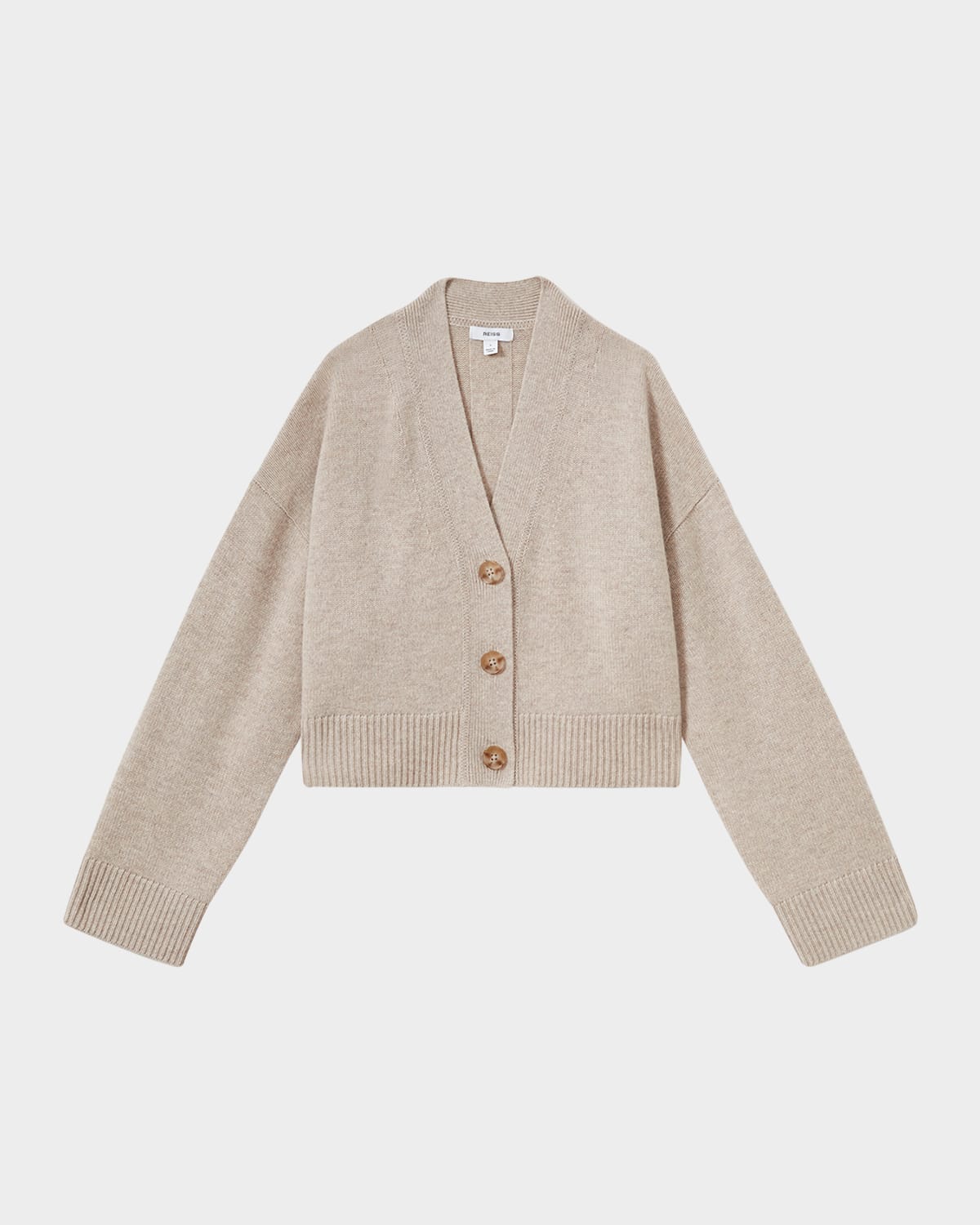 Reiss "Rixy" fine ribbed cardigan V neckline; button front Drop shoulders Long sleeves Cropped style Relaxed fit Wool/cashmere Unlined Hand wash Imported