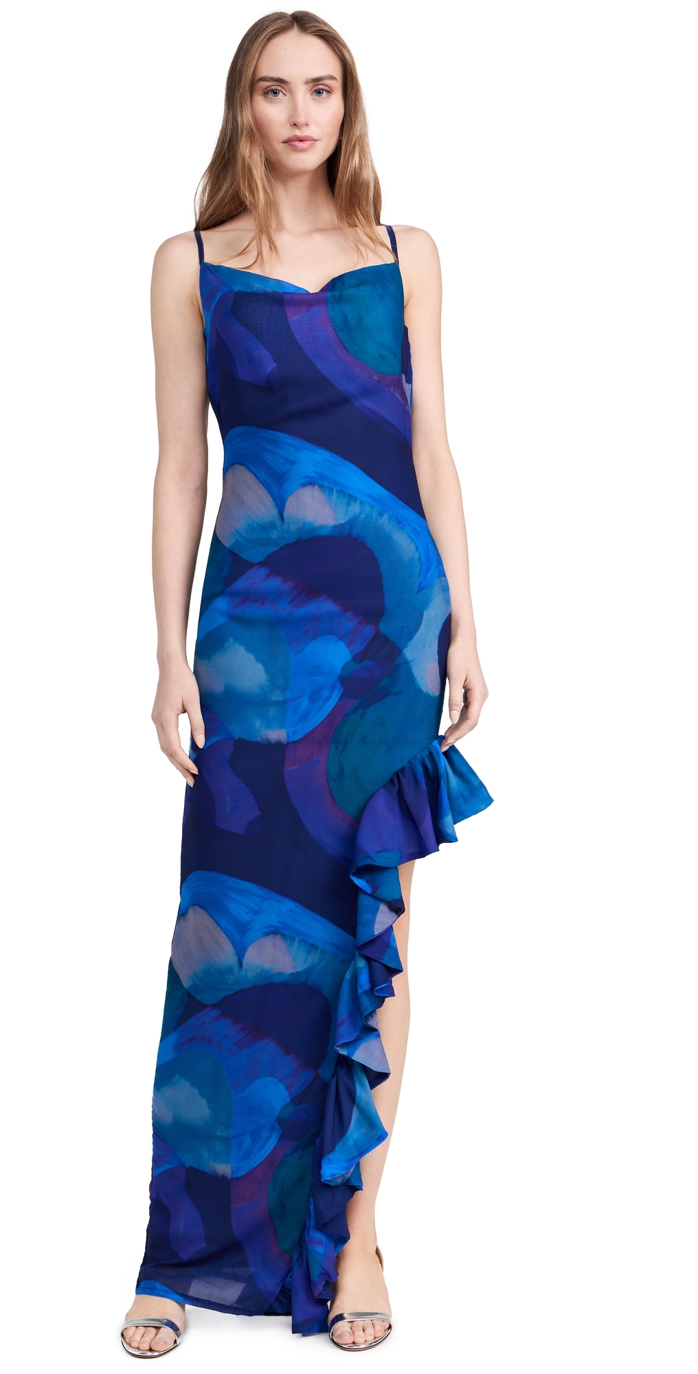 Fabric: Lightweight, non-stretch chiffon. Asymmetrical hem with ruffle trim. Cowl neck. Adjustable shoulder straps. Hidden zip at side. Shell: 100% polyester. Dry clean. Imported, Nigeria. Measurements: Measurements from size 2 Length: 34.75in / 88.0cm, from shoulder to shortest point Length: 62.25in / 158.0cm, from shoulder to longest point
