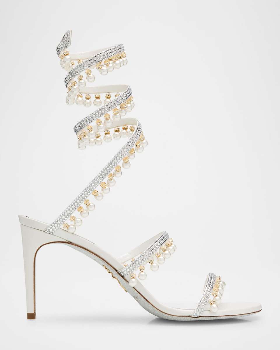 Rene Caovilla "Chandelier" sandal in crystalbeaded satin with dangling crystal briolettes. 3.15 in / 80 mm stiletto heel. Two band upper. Signature snakeshaped spiral anklewrap strap. Signature glittered outsole. Made in Italy.
