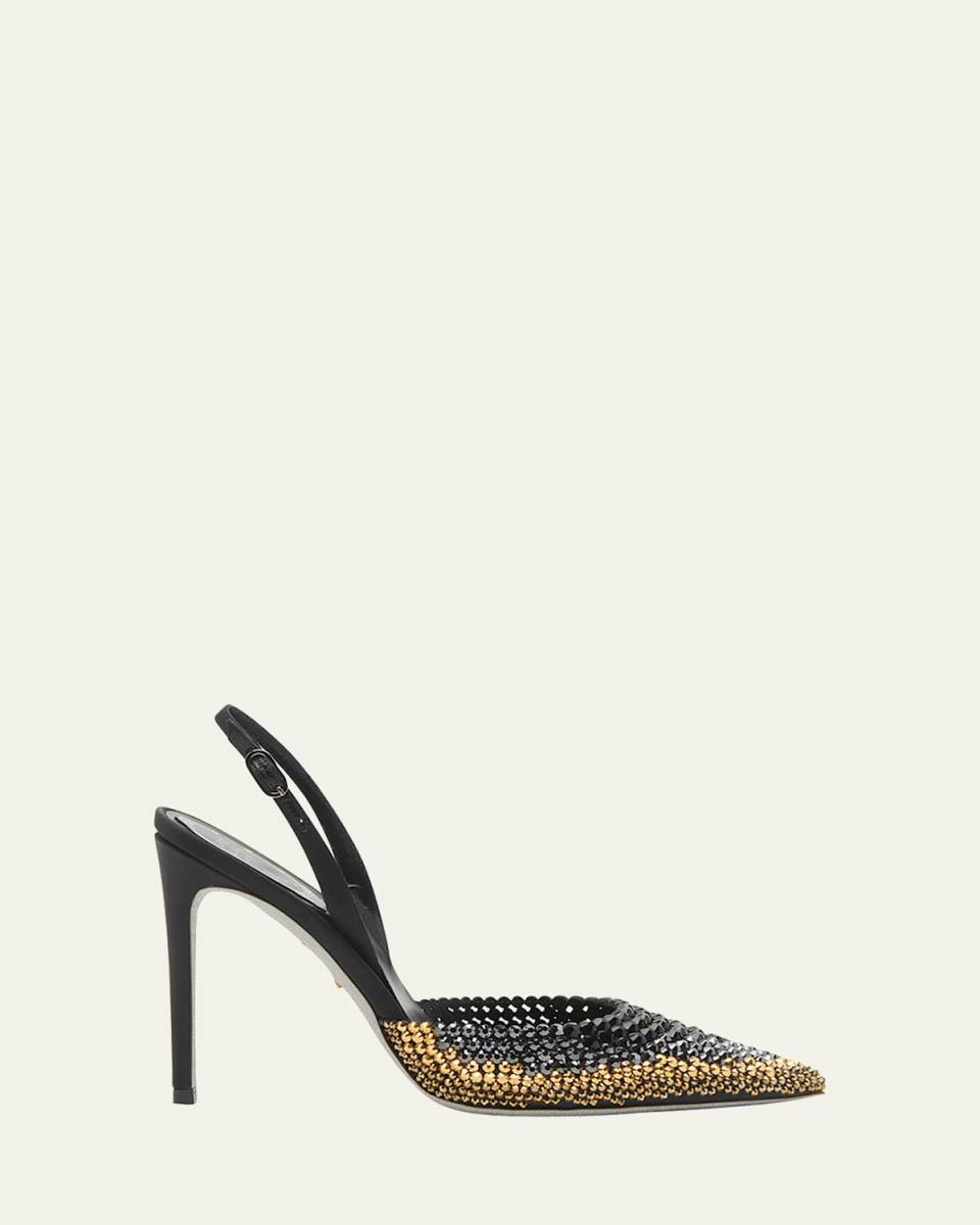 Rene Caovilla crystal studded satin pumps 4.25 in / 105 mm stiletto heel Pointed toe Adjustable slingback strap Leather outsole Lining: Leather/suede Made in Italy