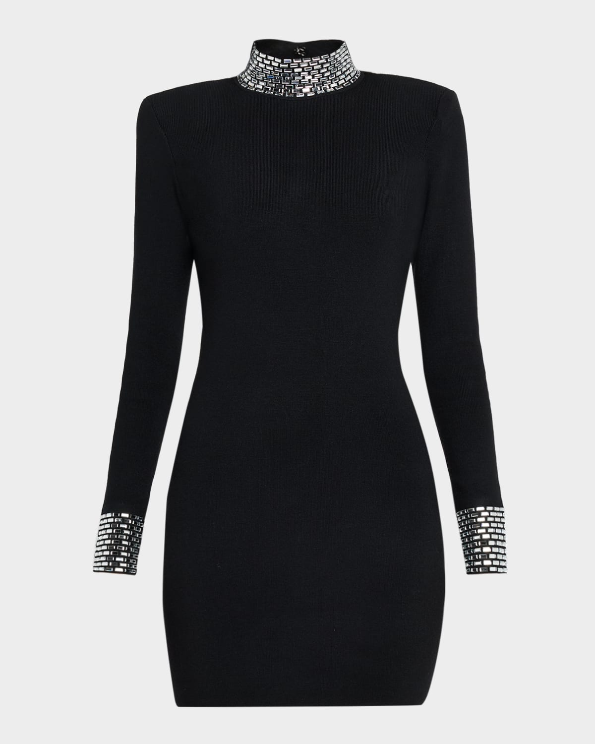 Finished with shimmering crystal embellishment, the "Corinth" mini dress by Retrofete is crafted from ribbed knit for a comfortable yet chic silhouette. High neckline Structured shoulders Long sleeves Bodycon silhouette Hem falls above the knee Back keyhole closure Nylon/polyamide/acrylic Dry clean Imported