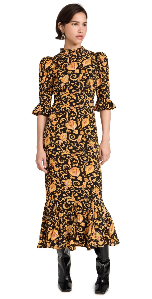 Fabric: Lightweight, non-stretch satin. Baroque heart print. Ruffle trim. 3/4 puff sleeves. Round neckline. Hook-and-eye and hidden zip at back. Shell: 100% viscose. Lined. Lining: 100% polyester. Dry clean. Imported, China. Measurements: Measurements from size 0 Length: 50.5in / 128.0cm, from shoulder