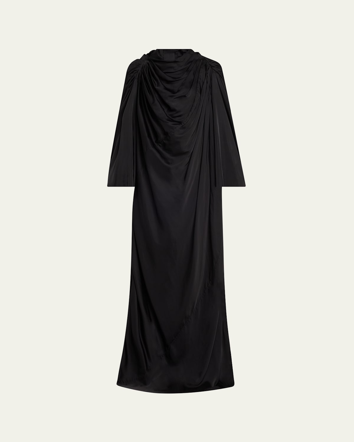 Rick Owens gown enhanced with draping and pleats on the shoulders Round neckline Long, wide sleeves Loose silhouette Intended to sweep the floor Buttoned back neck closure Acetate/viscose Made in Italy
