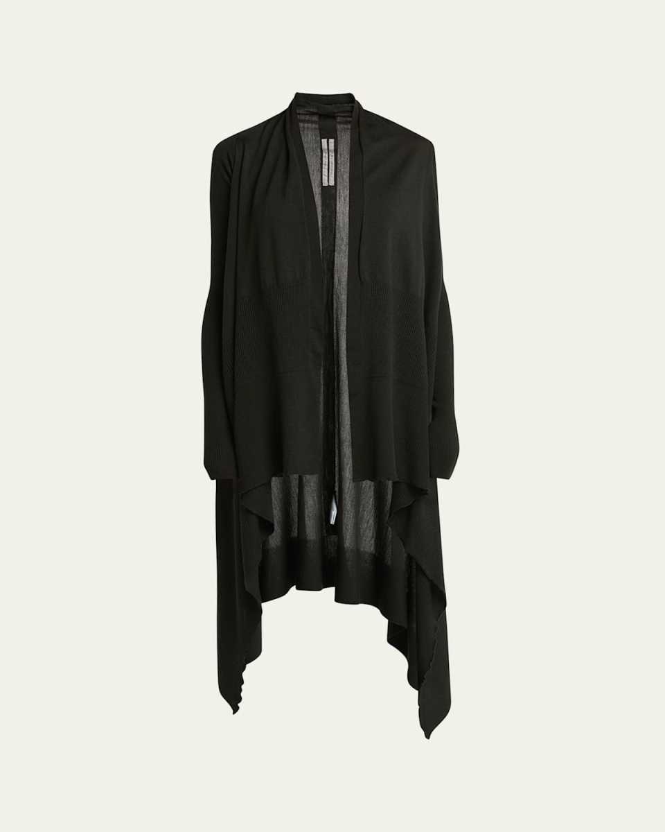 Rick Owens long wrap cardigan Approx. 27.5" L from shoulder to hem High neckline; open front Long sleeves Loose fit Handkerchief hem Wool Made in Italy