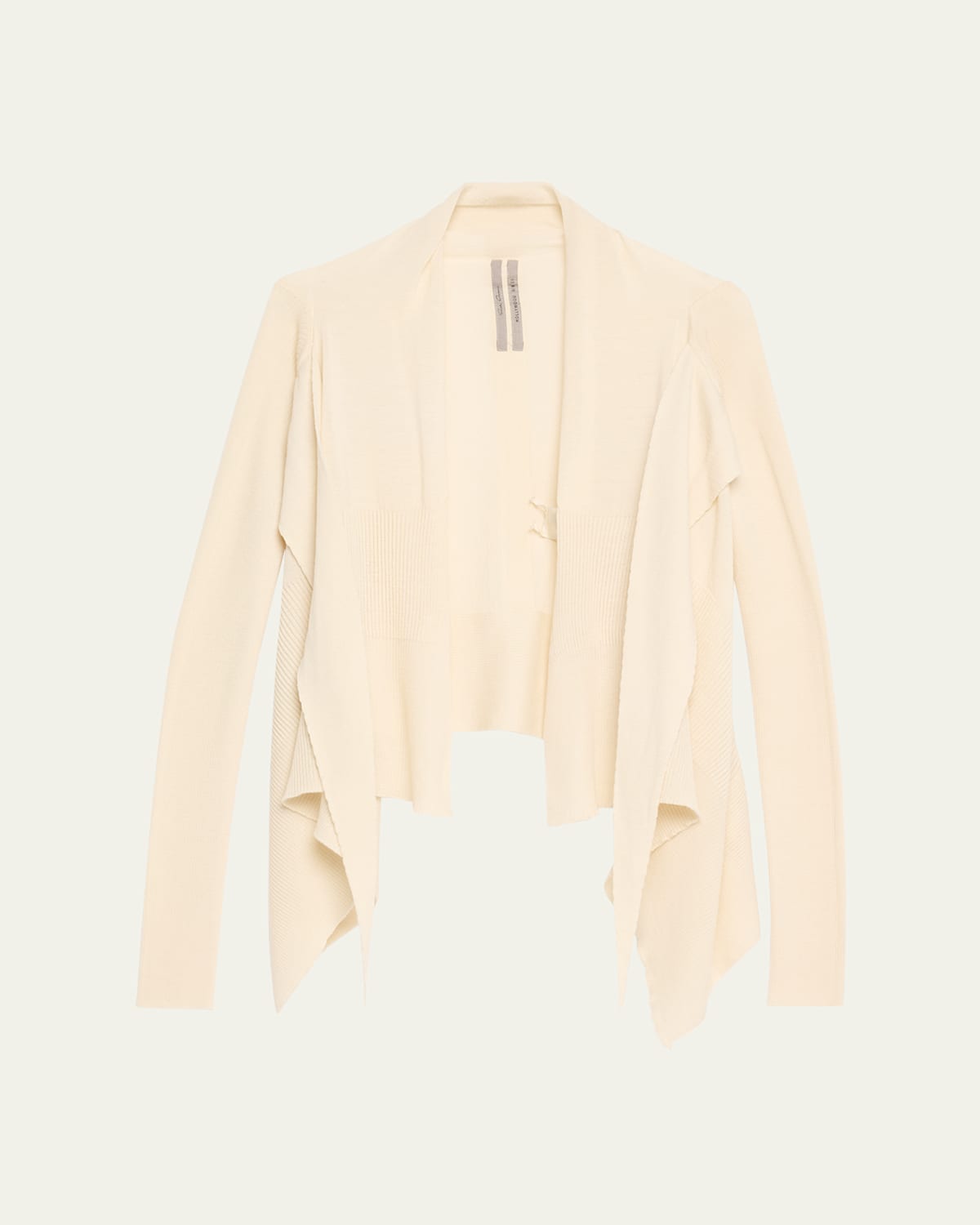 Rick Owens semisheer cardigan sweater Shawl collar; open front Long sleeves Wrapped silhouette Asymmetric flutter hem Short length Wool Made in Italy