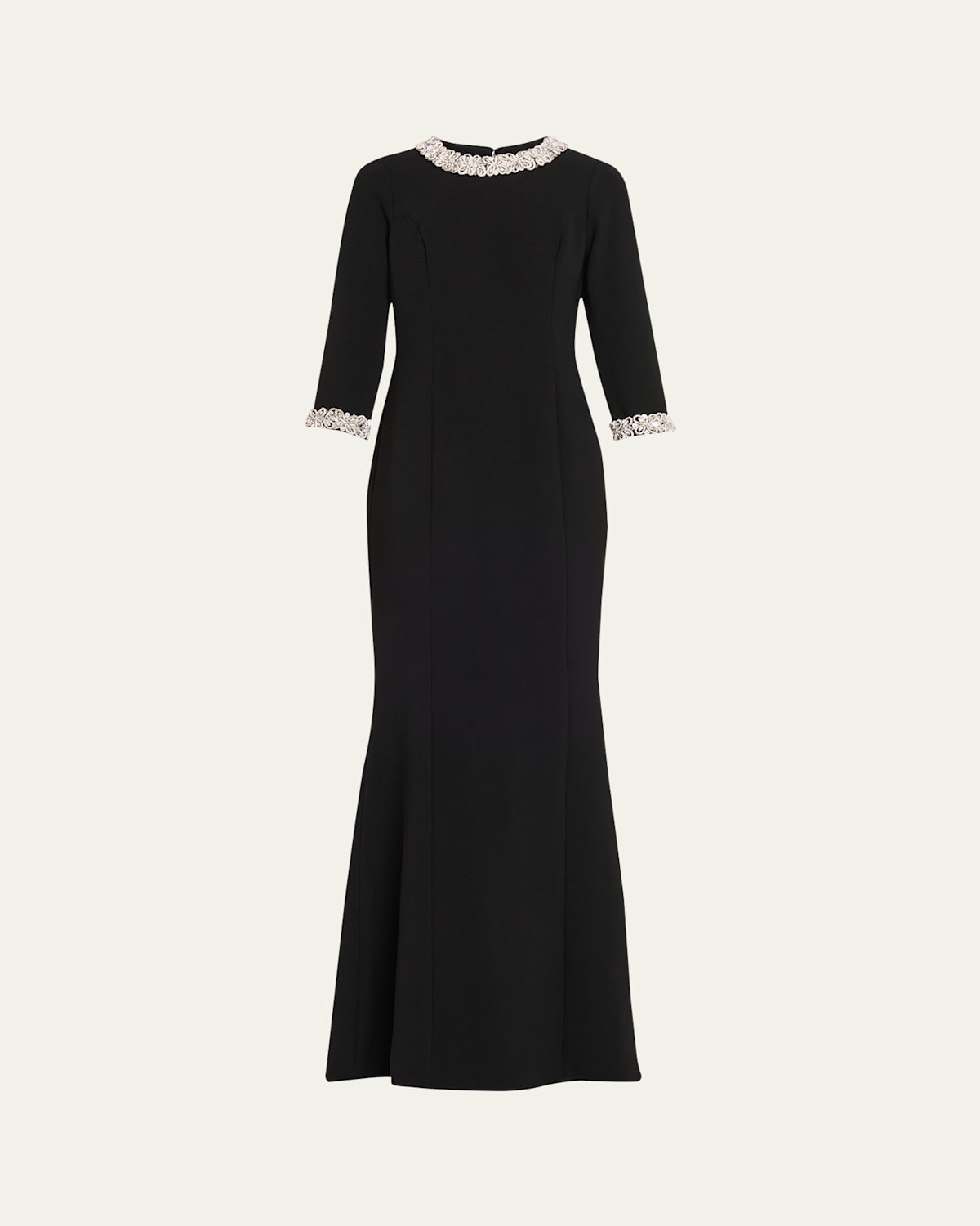 This Rickie Freeman for Teri Jon gown is cut from crepe with floral crystal trim along the neckline and cuffs for a touch of sparkle Approx. 63"L from shoulders to hem Jewel neckline 3/4 sleeves Princess seams Full length Mermaid silhouette Invisible back zipper Polyester/acetate Lining: Polyester Dry clean Trim: Beaded Imported