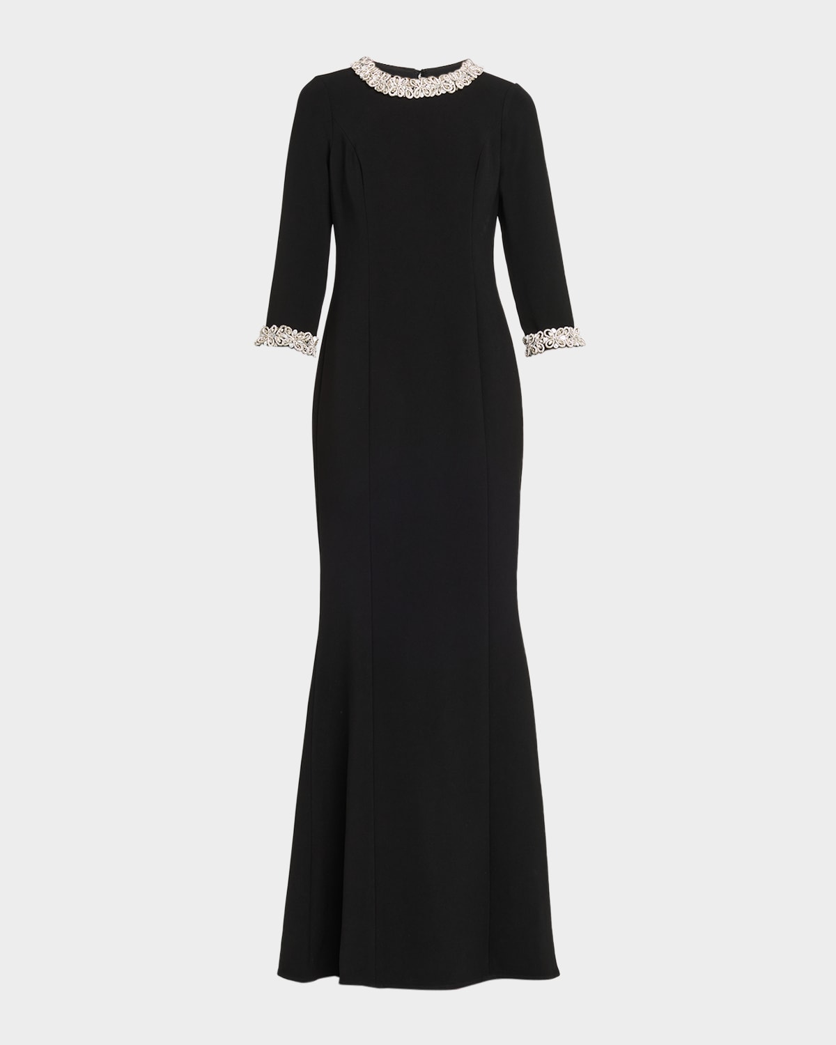 This Rickie Freeman for Teri Jon gown is cut from crepe with floral crystal trim along the neckline and cuffs for a touch of sparkle Approx. 63"L from shoulders to hem Jewel neckline 3/4 sleeves Princess seams Full length Mermaid silhouette Invisible back zipper Polyester/acetate Lining: Polyester Dry clean Trim: Beaded Imported
