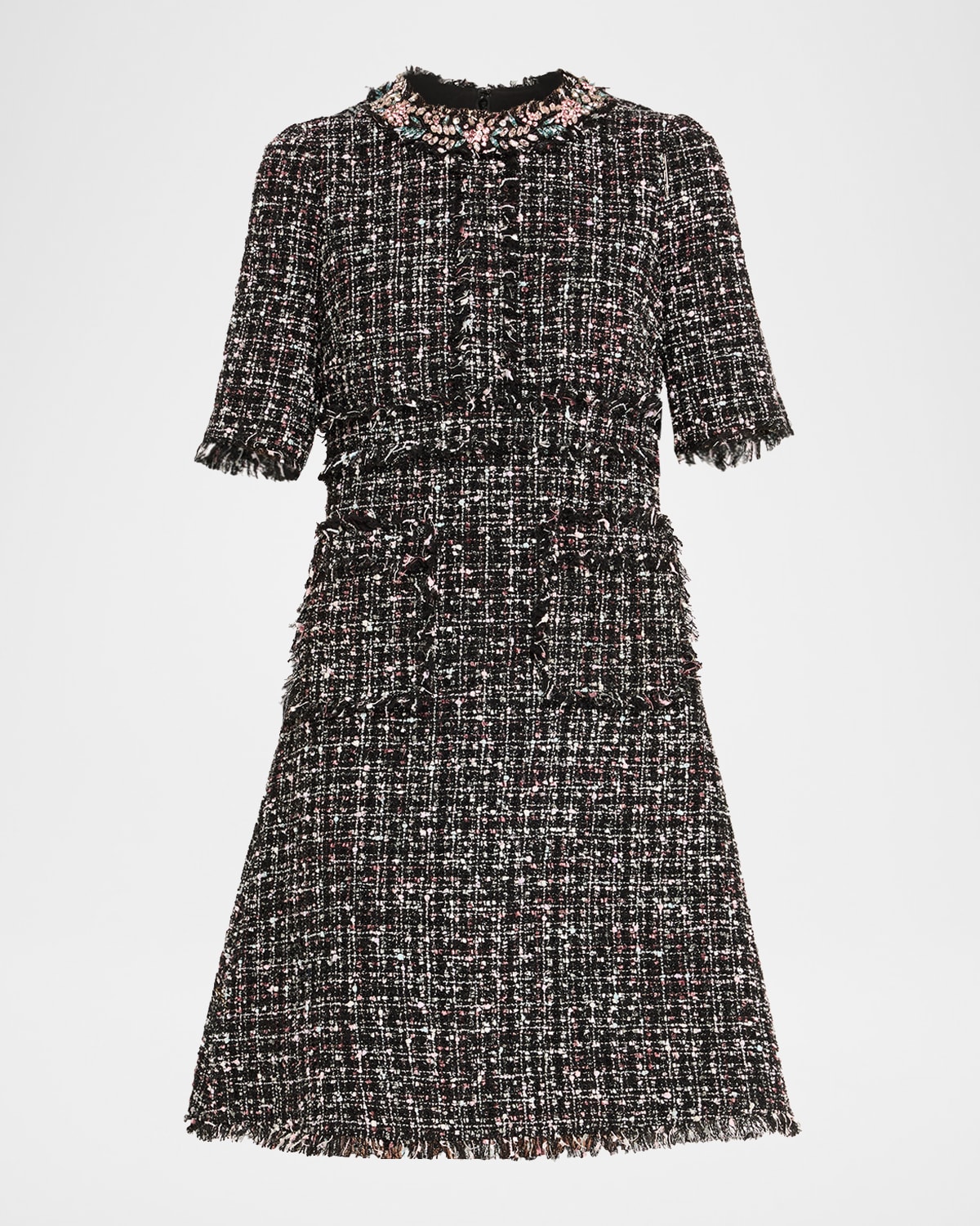 Decorated with plastic crystal trim, this Rickie Freeman for Teri Jon dress is crafted in tweed and features a heathered grid texture and fringed edges Approx. 40.5"L from shoulders to hem Jewel neckline Short sleeves Front patch pockets Hem hits around the knee Aline silhouette Invisible back zipper Polyester/cotton/viscose Lining: Polyester Dry clean Imported