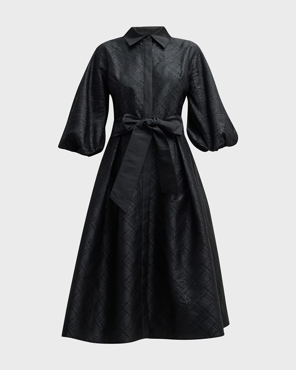 Rickie Freeman for Teri Jon midi dress in taffeta with sequinembellished diamond embroidery Approx. 47"L from shoulders to hem Spread collar; hidden button front Elbow blouson sleeves Waist selftie Onseam pockets Hem falls below the knee Aline silhouette Polyester Imported