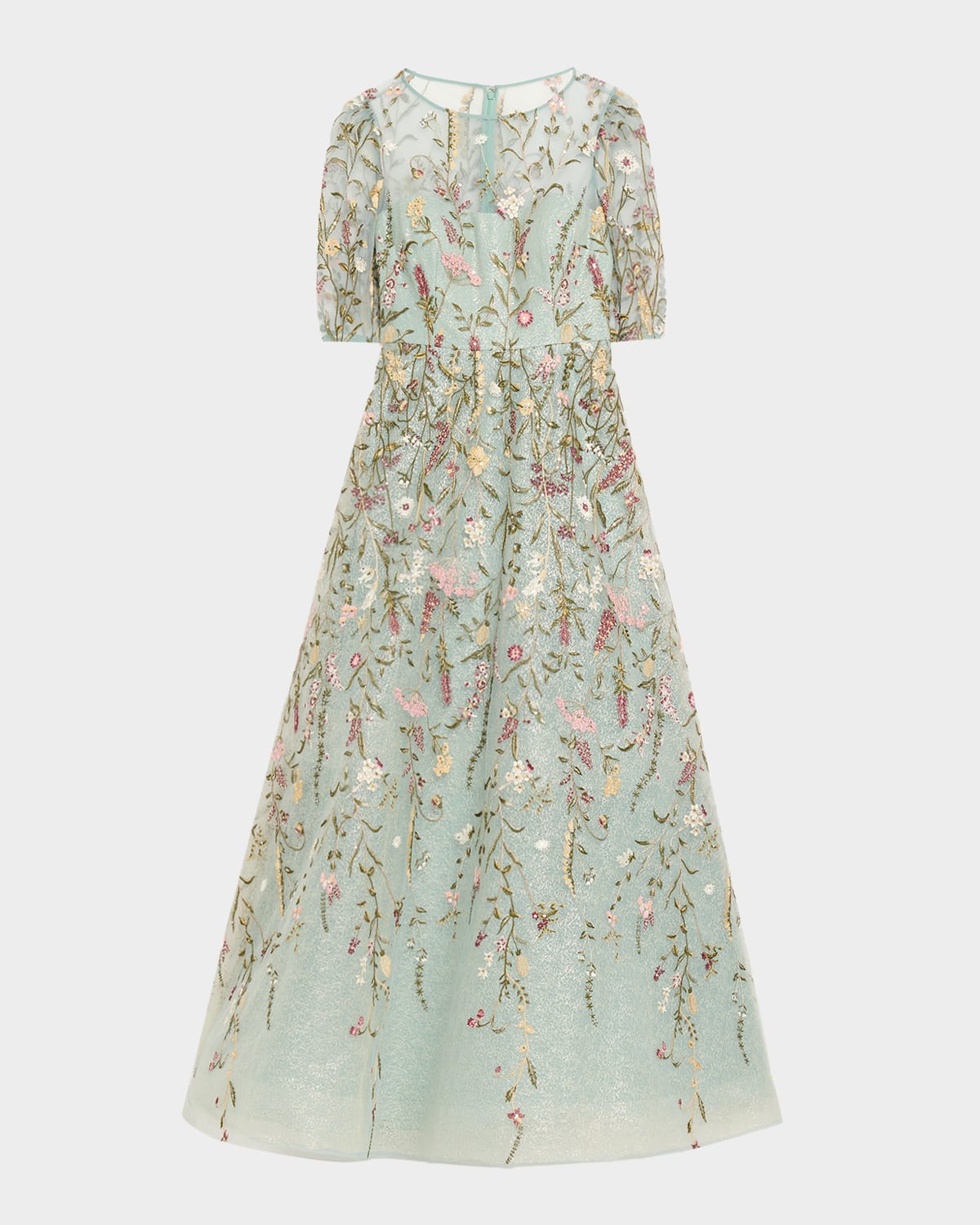 Delicate floral embroidery cascades down this Rickie Freeman for Teri Jon gown, crafted with a shimmer mesh overlay for a lightweight, ethereal effect Approx. 64"L from shoulders to hem High neckline; sweetheart illusion Elbow sleeves Full length Aline silhouette Invisible back zipper Polyester Lining: Polyester Dry clean Imported
