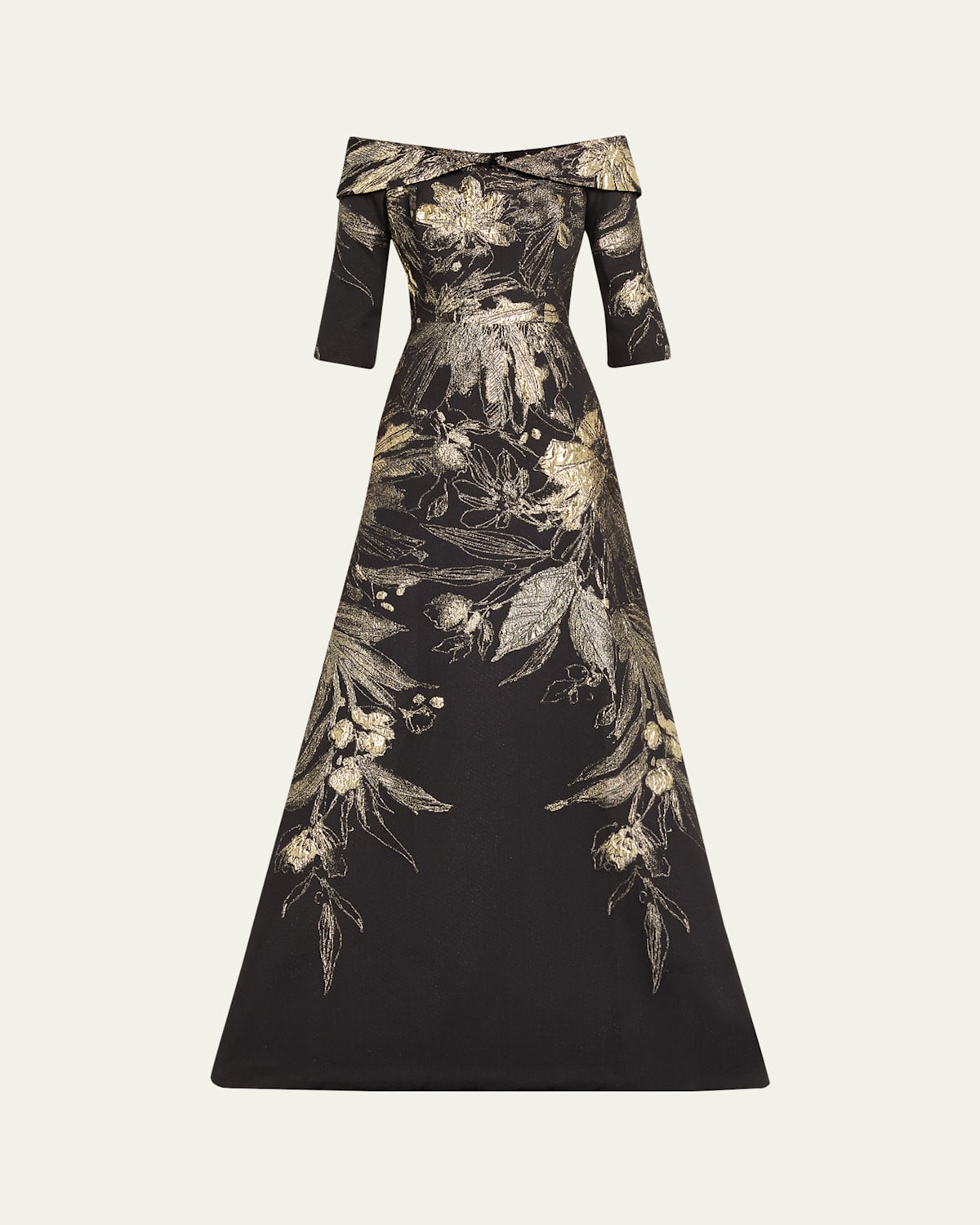 Rickie Freeman for Teri Jon metallic jacquard gown exudes timeless elegance, featuring a softly folded neckline and intricate shimmering floral patterns Approx. 62.75" from shoulder to hem Offtheshoulder neckline Threequarter sleeves Floor length Aline silhouette Concealed back zip closure Polyester/metallic fibers Lining: Polyester Dry clean Imported