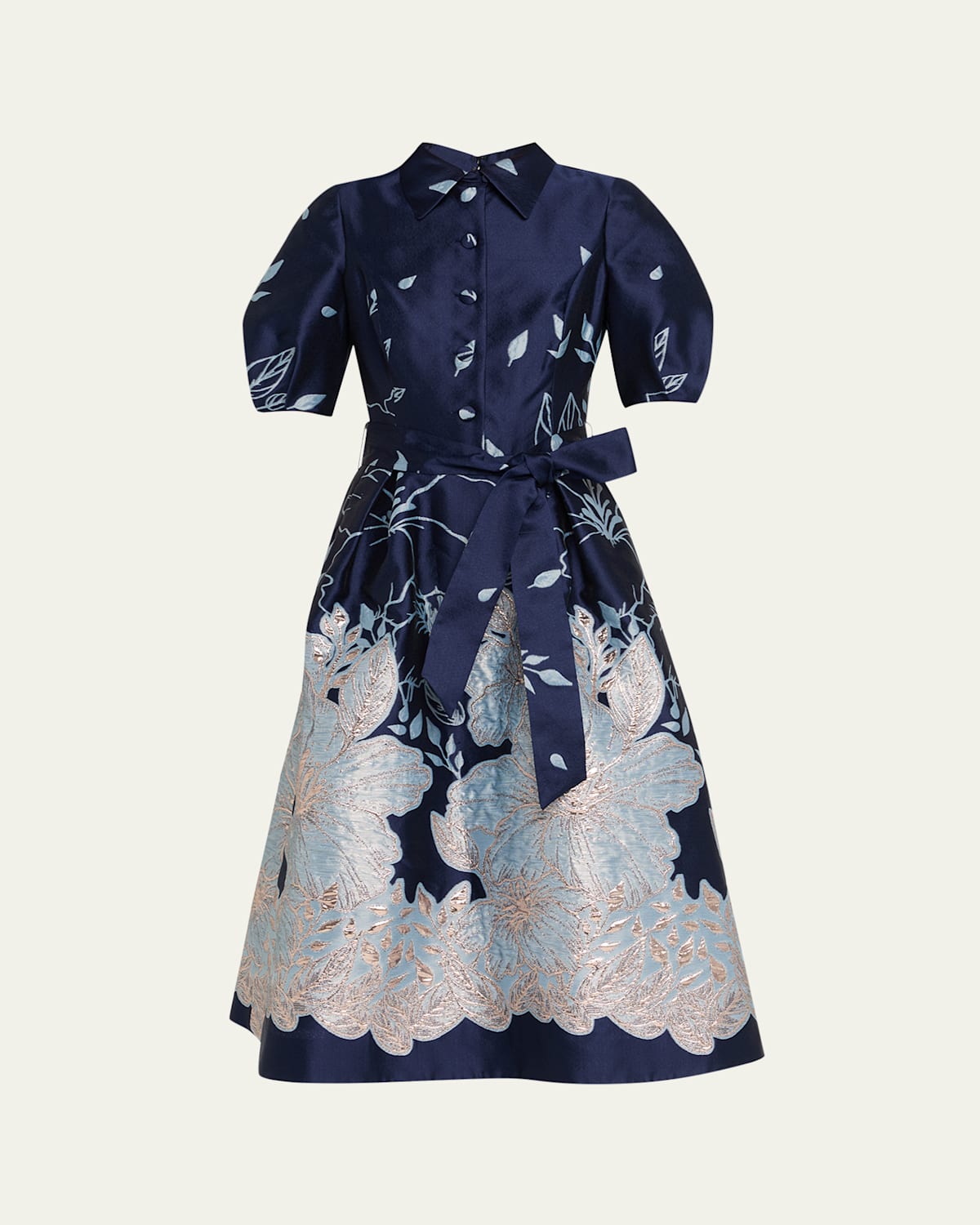 This classic midi shirtdress from Rickie Freeman for Teri Jon shimmers in metallic floral jacquard, the structured skirt adding a perfect figureflattering flare Spread collar; button front Short puff sleeves Princess seams Waist selftie Hem falls below the knee Aline silhouette Invisible back zipper Polyester/metallic fibers Lining: Polyester Dry clean Imported