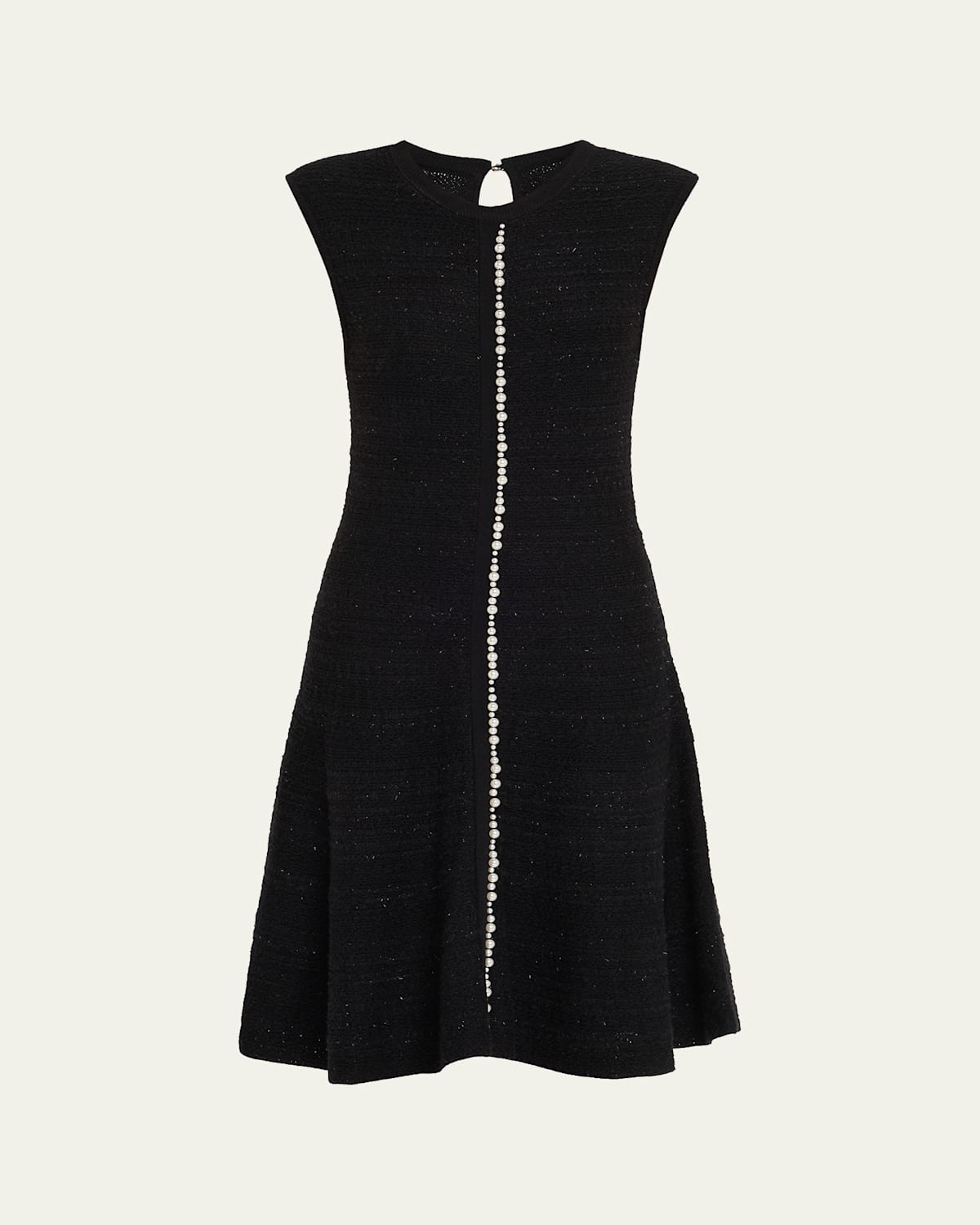 This Rickie Freeman for Teri Jon midi dress is cut from a subtly shimmering metallic tweed knit, detailed with a longline string of pearlescent plastic beads Approx. 39.5"L from shoulders to hem V neckline Sleeveless Hem hits around the knee Aline silhouette Keyhole button back Slipover style Nylon/polyamide/wool/acrylic Dry clean Imported