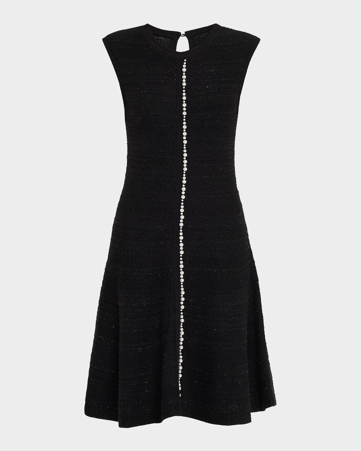 This Rickie Freeman for Teri Jon midi dress is cut from a subtly shimmering metallic tweed knit, detailed with a longline string of pearlescent plastic beads Approx. 39.5"L from shoulders to hem V neckline Sleeveless Hem hits around the knee Aline silhouette Keyhole button back Slipover style Nylon/polyamide/wool/acrylic Dry clean Imported