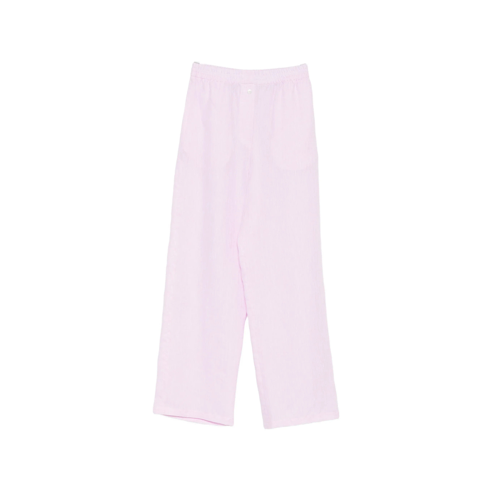 pink slub texture straight leg elasticated waistband two side slit pockets rear patch pocket front button fastening relaxed fit