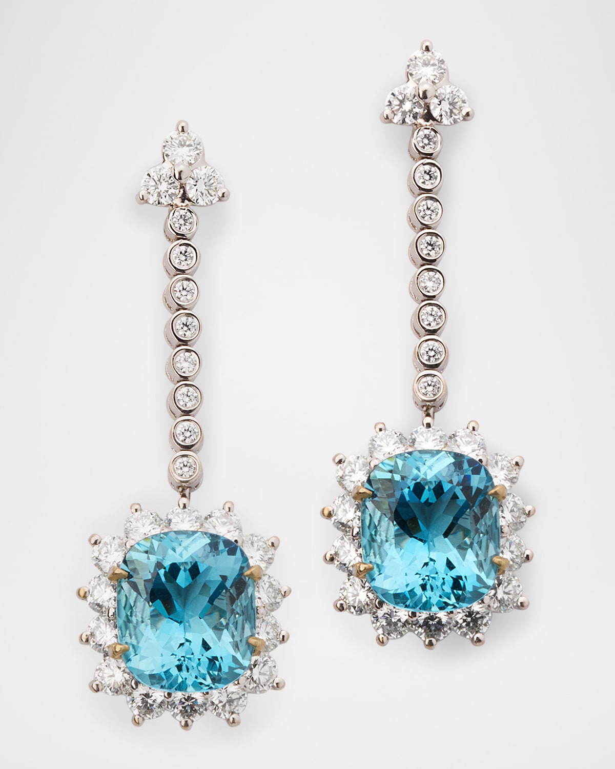 Robert Erich drop earrings 18karat white gold 50 round white diamonds Diamond total carat weight: 2.50 Two cushioncut Brazilian aquamarine Aquamarine total carat weight: 7.61 For pierced ears Made in USA