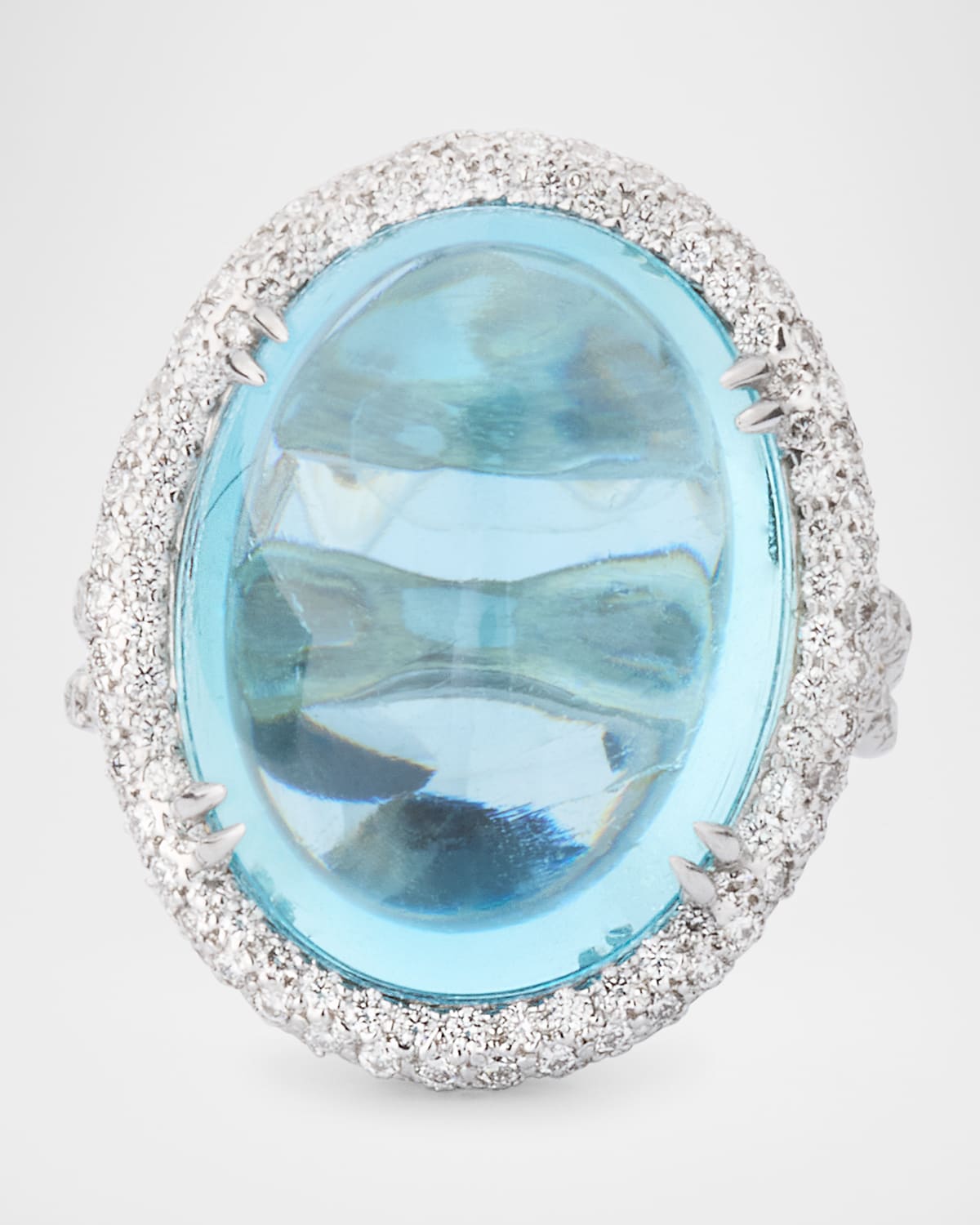 Robert Erich statement ring 18karat solid white gold Oval cabochon aquamarine and diamonds 188 diamonds Total diamond carat weight: 1.30 Size 6 Made in USA