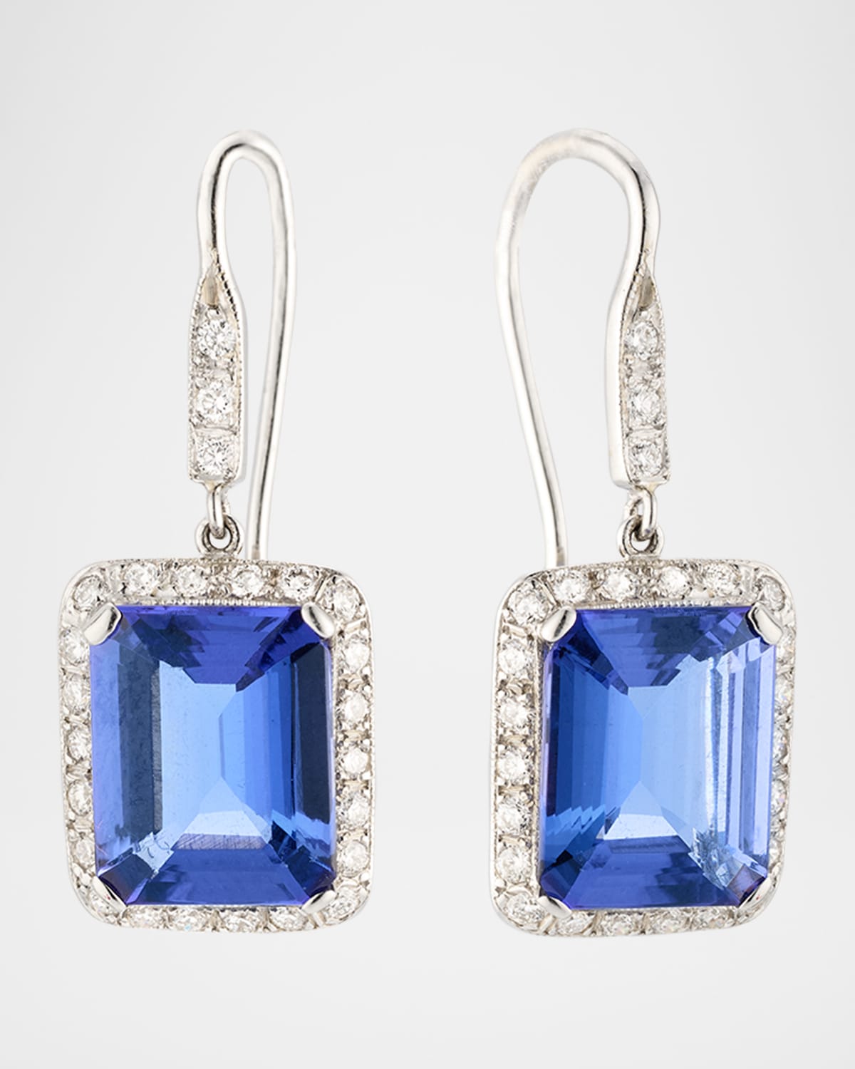 Robert Erich drop earrings 18karat solid white gold Emerald cut tanzanite 50 diamonds Total diamond carat weight: 0.80 For pierced ears Made in USA