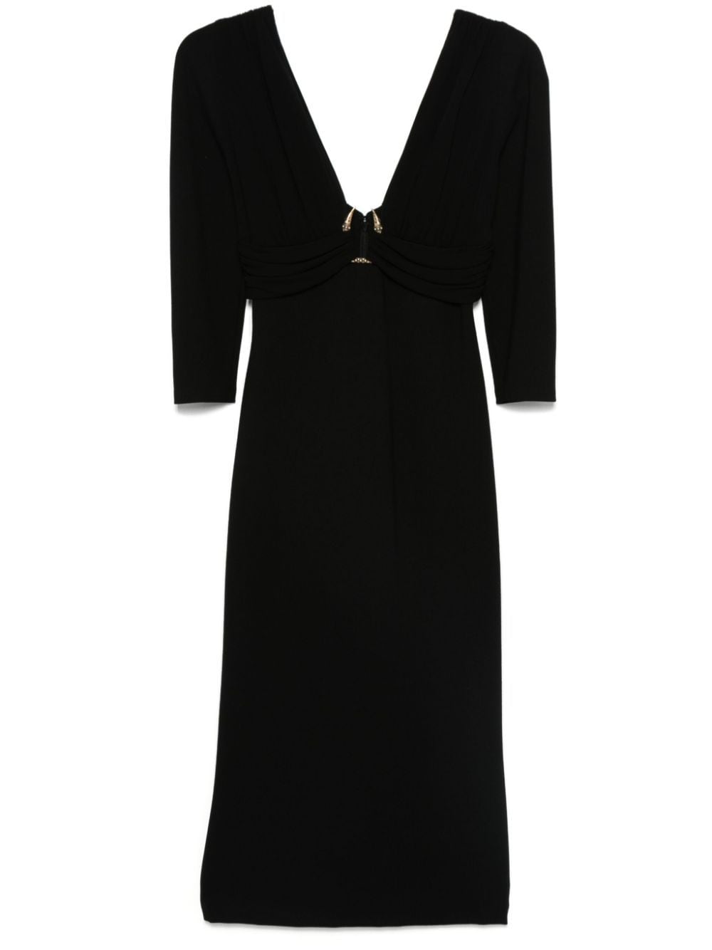 black stretch-jersey claw detail concealed rear hook and zip fastening plunge style draped detailing three-quarter length sleeves empire line pencil silhouette straight hem mid-length