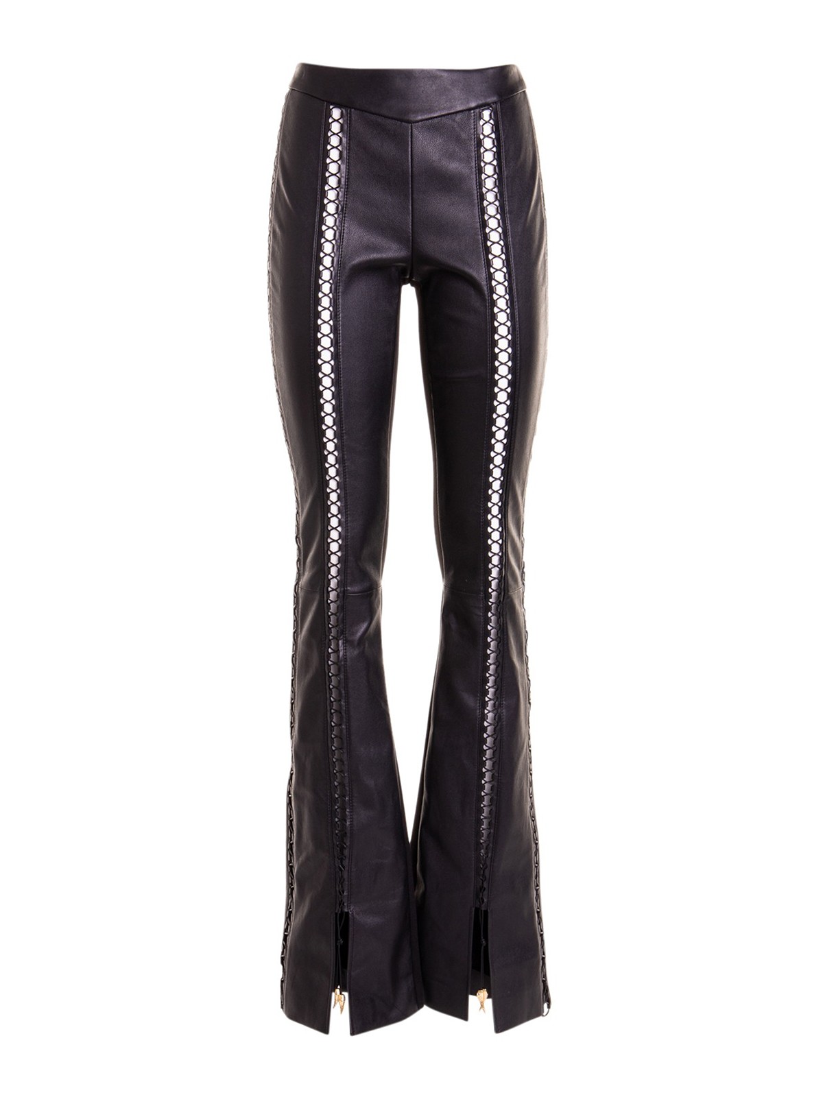 Pantalon en cuir noir avec coupe classique, fermeture zippée, bas évasé, logo métallique, tissu bi-matière, broderie, détails en métal.
