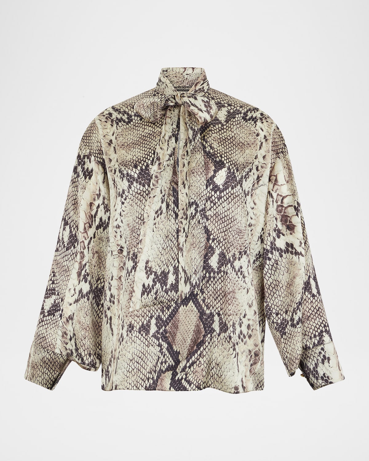 Roberto Cavalli blouse is crafted of a pythonprinted silk featuring a neck scarf Vneckline; selftie neckline Long blouson sleeves; button cuffs Loose fit Straight hem Pullover style Silk Made in Italy