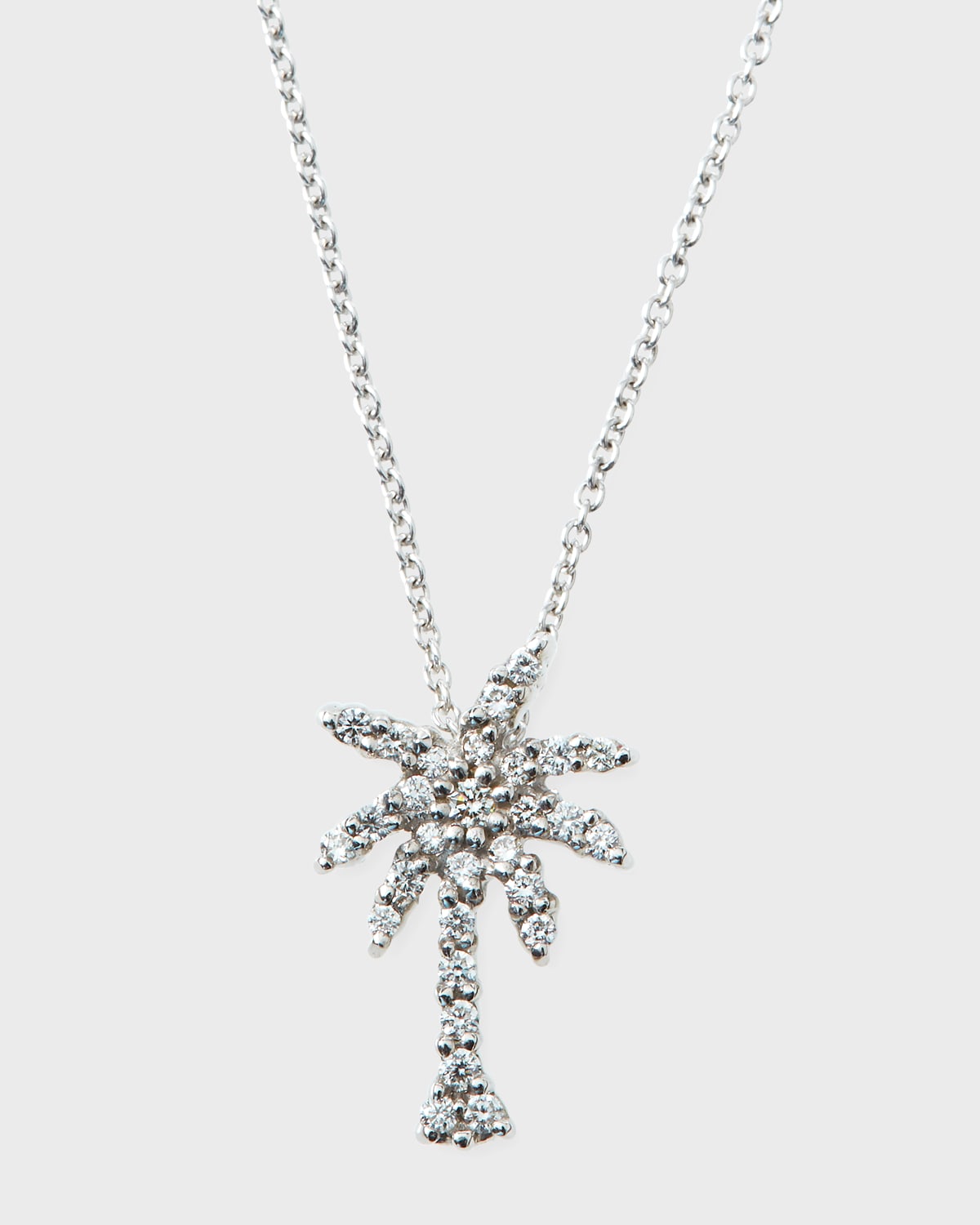 Palm Tree necklace by Roberto Coin. Polished 18karat white gold or yellow gold hardware. Rolo chain with diamond pavé palm tree. 0.18 total diamond carat weight. Signature hidden synthetic ruby. Approx. 1618"L; 0.5"L drop. Adjustable; lobster clasp. Made in Italy.