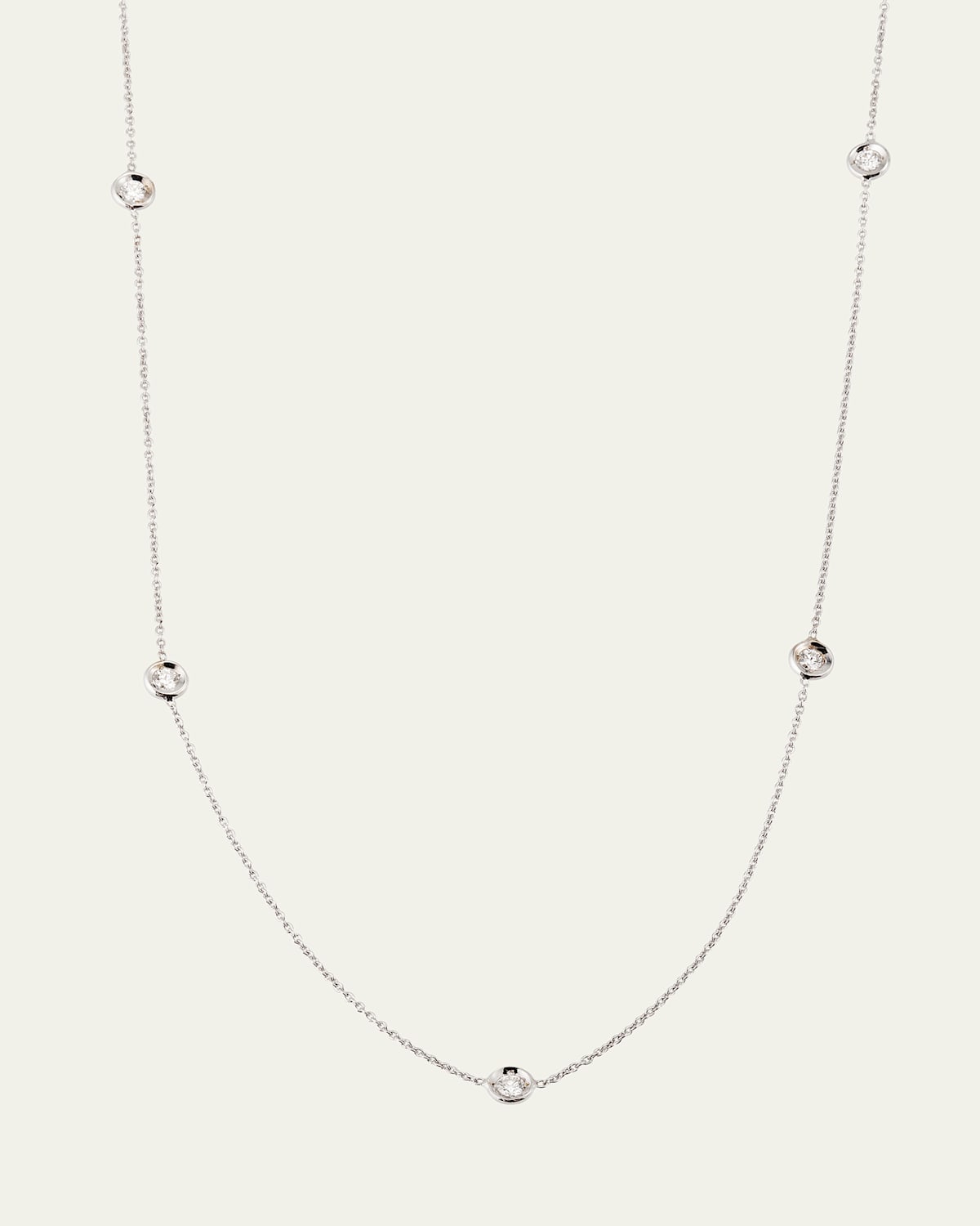 18karat solid gold. Five, round bezelset diamond stations. Cable chain necklace. 0.23 total diamond carat weight*. *All gemstone carat weights (ct. t.w.) are approximate; variance may be 0.05 carat. Interior of jewelry piece includes signature synthetic ruby detail. Necklace, 16"L; 2" extender with lobster clasp. Lobster clasp.