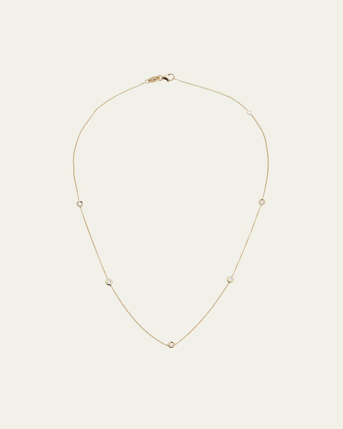 18karat solid gold. Five, round bezelset diamond stations. Cable chain necklace. 0.23 total diamond carat weight*. *All gemstone carat weights (ct. t.w.) are approximate; variance may be 0.05 carat. Interior of jewelry piece includes signature synthetic ruby detail. Necklace, 16"L; 2" extender with lobster clasp. Lobster clasp.